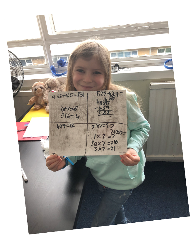 | Lydia in Y3 practicing all 4 maths operations. Here you can see how she is applying her skills in Place value to help; Using known facts to help work out the answers too. | ![]() |